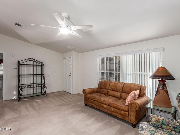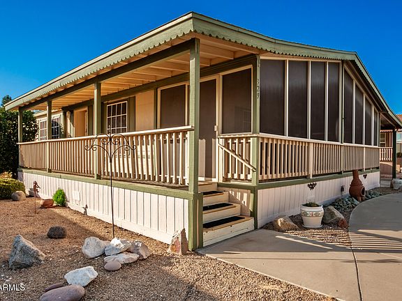 Well-cared for 1992 Palm Harbor manufactured home ready to go! Be greeted by a porch and a 2-carport space. Immaculate interior offers vaulted ceilings, carpet/vinyl floors, neutral paint, 2-split bedrooms, and a spacious living room for entertaining. The eat-in kitchen includes a plethora of cabinets, built-in appliances, ample counters, and a pass-through window. Both bedrooms boast walk-in closets for added comfort. The main suite features a private bathroom with dual sinks, while the secondary bedroom has direct access to the guest bathroom. Out the back, you'll find a convenient workshop. Oversized screened patio allows you to enjoy the Arizona weather all year round. Don't miss this chance! Home must be owner occupied in this 55+ community.