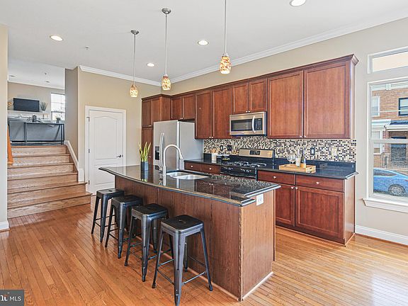 Rarely available End-of-Group home with 4 bedrooms, 4.5 baths and GARAGE PARKING! This home is very unique with THREE bedroom suites! As you enter the home the spacious kitchen and dining room greet you. These spaces offer hardwood floors, granite counters, stainless steel appliances, 42" cabinetry, a large island that seats four, pantry, and a large dining room for entertaining. A few steps up and you are are in the oversized living room that is perfect for entertaining or large family gatherings as you sit by the gas fireplace. The multi-level living in this home, allows for plenty of space to spread out. The upper levels have 4 bedrooms and 3 baths. These are not your typical bedrooms, each is flooded with natural light, has expansive sqft, tall ceilings, and large closets. The two rear bedrooms have their own private balconies! The finished basement has lots of natural light, and a full bath making it ideal for guests or an office space. Additional features include a wet bar, new flooring, and fresh paint throughout.