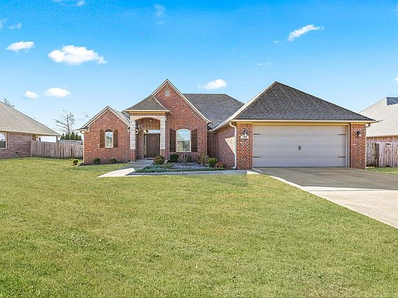 Gorgeous home in the Cornerstone Ridge Subdivision! Open concept living defined by sophisticated details, including hand-scraped wood flooring, crown molding and granite countertops. Main area boasts beautiful brick feature wall that has built-in bar seating from kitchen and corner gas-log fireplace. Eat-in kitchen is equipped with ss appliances, custom cabinetry, walk-in pantry and stone backsplash. Dedicated formal dining for gathering or intimate dining options. Split bedroom floorplan offers spacious bedrooms. Luxurious primary suite has tray ceilings, walk-in closet, dual sink vanity, jacuzzi tub and separate shower. Stunning covered patio boasting vaulted ceiling and brick fireplace. Extended open patio and fully fenced backyard provides room for everyone! Epoxy garage floor assists with extreme durability for everyday living. Updated with new roof in 2023. Prime location moments away from parks, shopping, schools and only 10 mins from XNA. This is the one you've been waiting for!