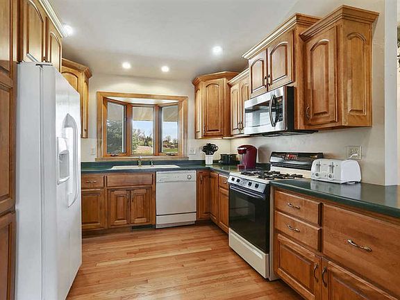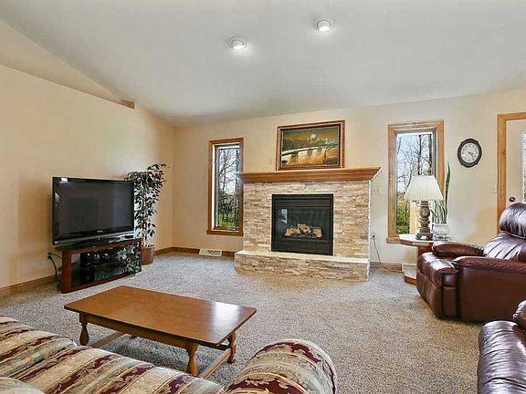 Custom walk-out ranch with over 1/2 acre beautifully landscaped lot features front entrance leading to spacious living room w/vaulted ceiling & gorgeous flagstone/granite fireplace. Kitchen features an abundance of maple cabinets & counter space, large snack bar & hardwood flooring w/access to deck from dining area. Master bedroom w/walk-in closet & private full bath w/double shower & whirlpool tub. Finished LL w/full kitchen, family room, bedroom & full bath. Great for home daycare or in-law suite. 2 stall attached garage w/addtl garage underground in LL. Pre-inspected w/1 yr home warranty!