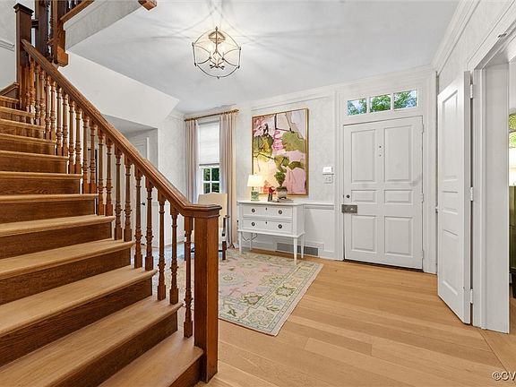 Timeless 1941 Cape Cod in Windsor Farms offers charm and curb appeal, a spacious lot with a pool and detached garage. Classic architectural details blend seamlessly with thoughtful modern updates, including refinished random-width oak floors, 9+ ft ceilings, raised panel doors, multi-member moldings, true divided light windows, and antique brass hardware. The gracious Entry Hall opens to a large Living Room with gas fireplace and French doors, and a banquet-sized Dining Room with bay window overlooking the lush backyard and private, fenced pool with updated equipment. A cozy paneled Den or library with gas fireplace adjoins the first-floor Primary Suite with en suite Bath and adjacent Study—ideal as a home office or walk-in closet. The bright, eat-in Kitchen features a gas fireplace, paneled Sub-Zero fridge, Jenn-Air cooktop, GE double ovens, and Asko dishwasher. A sunny brick-floored Sunroom with 8 arched windows, vaulted beadboard ceiling, and bar cabinet offers a relaxing retreat. Upstairs includes a second Primary Bedroom, two additional Bedrooms, and two full Baths, plus a walk-in attic with cedar closet. The newly finished lower level features a spacious family room with new flooring—perfect as a den, TV room, or overflow space. The oversized 2-car Garage includes a workshop and could easily become a pool house. The large unfinished room above is ideal for an art studio, office, or bonus space. Irrigation, security system, and whole-house generator complete this exceptional property.