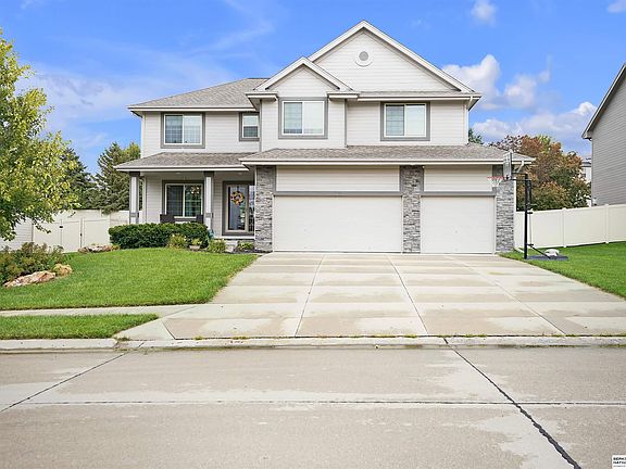 Immaculate Bradbury 2-Story by Sherwood Homes, built in 2017 and remodeled in 2023, located in top-rated Elkhorn Schools. This 4 bed/5 bath home features a finished basement with a wet bar and full bath. The main level offers new LVP flooring, an open layout, and an updated kitchen with granite counters, large island, backsplash, vent hood, and walk-in pantry, plus a convenient drop zone. Upstairs, every bedroom has a walk-in closet, and the primary suite includes two walk-ins and a tiled shower. Outside you'll find a covered front porch, fenced landscaped yard, and a covered patio. The 3-car garage includes shelving, a sump pump, and battery-backup opener. Enjoy walking distance to Whitehawk Lake and park. City maintained with no HOA fees. Bright, modern, and move-in ready in a prime location.