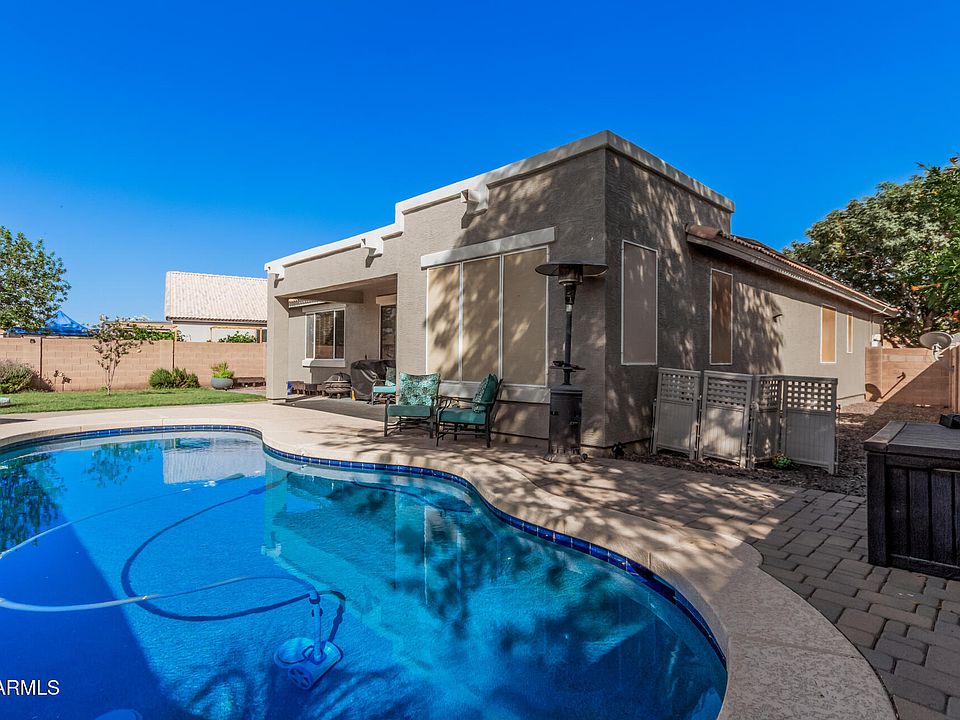 Stylish 3 bed, 2 bath + office/den (or 4th bedroom) with open floor plan & luxury vinyl plank throughout. Remodeled kitchen w/ stainless appliances flows to great room & covered patio—ideal for entertaining! Both baths tastefully updated. Private backyard oasis w/ sparkling pool, no rear neighbors & no 2-stories next door. New AC (2022), owned solar & new dishwasher = savings + peace of mind. The perfect blend of comfort, convenience & charm!