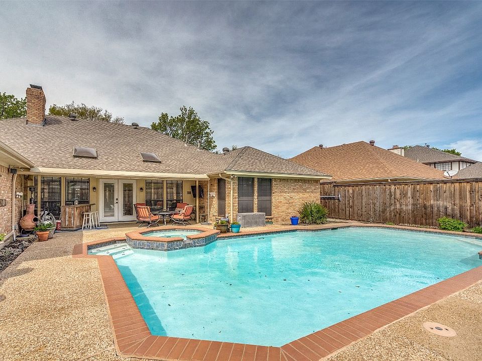 Beautiful single-story in the heart of Plano! Timeless elevation, exposed interior brick for character and charm. Backyard is a private oasis with covered patio, volleyball pool, raised spa, 7ft fence, grill area and outdoor TV! Upon entering you are greeted with beautiful brick columns, crown molding and high ceilings. Large formal living room has brick wood burning fireplace, rich paneling, wood beams, 20-inch ceramic tiles and laminate wood floors. Excellent floor plan w_ three living areas, 3 full baths, and split bedroom arrangement. Great flow for entertaining! 8 ceiling fans, wet bar in DEN, 2 inch blinds, skylights, fresh paint, crown molding, tract lighting and designer plumbing fixtures. Oversized utility room with built-ins, room for freezer. Kitchen has granite tops and backsplash, undermount SS sink, commercial faucet and SS appliances. Large primary BDRM has view of pool. Primary bath has double sinks, 18 inch tiles, updated shower, separate tub. Oversized garage. No HOA.