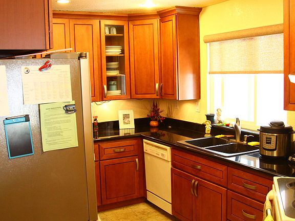 Private backyardContemporary style kitchenWedge-shaped lotBlack granite countertopCherry cabinetsCentral air conditioningDual pane windows