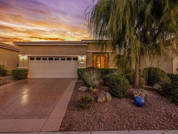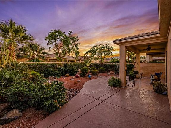 Model Home Excellence! A highly upgraded Embark model with East facing patio, 1321 SF built in 2013. Beautifully finished; just move in and enjoy! Upgraded 20 inch tile laid on the diagonal everywhere except bedrooms. Gorgeous kitchen with slab granite countertops, breakfast bar, glass tile backsplash, with stool height island, and upgraded stainless steel appliances; Miele dishwasher & Whirlpool microwave. Upscale pendant, recessed & lighting fixtures as well as ceiling fans. Spacious dining area & desk nook. Solar tubes in kitchen and guest bathroom providing splash of natural light. Primary bedroom has views of lushly landscaped, yet low maintenance back yard. Primary bath has dual-vanities, shower & walk-in closet. Guest bedroom has custom Murphy bed with glass display cabinets and lighting! Custom window treatments & Plantation shutters throughout. Phantom screens on slider door.Separate laundry room off kitchen.Open and spacious custom epoxy back patio extended beyond the covered portion ideal for sunning, dining and entertaining. Insulated garage with battery back-up door & windowed over-head. Extra storage. Eye-catching epoxy driveway. Great location close to clubhouse! Reasonable HOA dues of only $369 a month includes Guard gates, roaming security, common area maintenance and access to resort-style amenities including golf, tennis, pickleball, bocce, and sparkling pools and spas. Two beautiful clubhouses offer even more opportunities to stay active and social. Stop searching and start living the active lifestyle in Sun City Shadow Hills 55+ community.