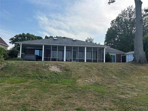 Simply breathtaking! This extraordinary waterfront home is located directly on the East Niagara River and features a harvest of amenities. Impressive curb appeal with brick exterior and nicely landscaped grounds. Foyer features a two sided gas stone fireplace shared with the living room and dining room. The family room is surrounded by so many windows to view the river and dock with lift. Kitchen has granite counters, island with breakfast bar and includes the appliances. First floor laundry includes washer and dryer. Primary suite has sliding doors to patio with hot tub. Primary bath has separate shower, soaking tub, walk-in closet and dual sink vanity with quartz countertop. Attached garage with water and pull down stairs to attic storage. Central air. Shed. Custom blinds.