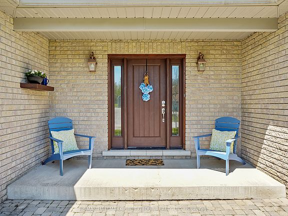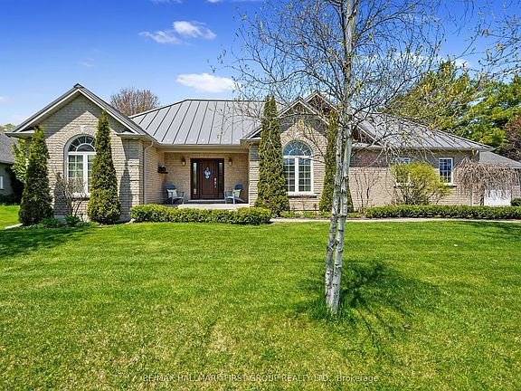Surrounded by trees and set on a private lot, this executive bungalow delivers more than 3,000 sq ft of stylish living space designed for comfort, function, and fun. A durable metal roof, attached garage, and spacious backyard with its own pickleball court make this property both practical and impressive. Inside, the inviting front foyer opens to a bright, well-planned interior. The dining room shines with a peaked ceiling, large front window with California shutters, and chic board-and-batten wainscotting. The living room offers a sleek propane fireplace framed by windows, updated flooring, and generous space for family gatherings, all flowing seamlessly into the kitchen. The kitchen is a standout with dual-level prep counters, built-in stainless steel appliances, a ceiling-height pantry, glass tile backsplash, recessed lighting, and an undermount sink. Just beyond, the sunroom with its built-in window seat and walkout invites you to unwind with a book or soak up backyard views. The adjoining family room, complete with built-in shelving, adds an extra layer of warmth and versatility. The primary suite is a retreat of its own, offering a walk-in closet with custom cabinetry and a spa-style ensuite with a soaking tub and glass shower. Two additional bedrooms and a full bath provide flexibility, while a guest bath and main floor laundry room add convenience. The finished basement extends your living space with a large rec room, games area, and a versatile bedroom currently set up as a gym, ideal for a studio, office, or home-based business. Outdoors, the private yard backs onto woods and offers a deck, patio, fire pit with seating, and a pickleball court for year-round enjoyment. All this, just minutes from amenities and with easy 401 access, makes this property the complete package.