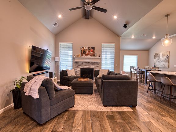 Welcome to your new home! This beautiful 4-bedroom, 2-bath home offers 1,900 sq. ft. of bright, open living space plus 285 sq. ft. of outdoor living for year-round enjoyment. The spacious floor plan features a stunning living area with a cathedral ceiling, stone fireplace, and large windows that bring in natural light. A charming barn door separates the bedrooms for added privacy.