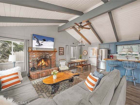 Escape to the beauty of Boulder Bay and discover a home filled with charm, warmth, and inviting views of the lake and distinctive rock formations—offering the sense of "Happy Use" from the moment you arrive. You enter into the lively bunk/game room, a flexible, fun-filled space with a stone fireplace, TV, foosball table & convenient ½ bath, setting a playful mountain vibe. The spacious primary bedroom, styled with a whimsical lake theme, offers a relaxed retreat after a day of adventure. Head upstairs to the bright great room, where vaulted ceilings & a classic brick fireplace create an inviting mountain atmosphere. Throughout the home, upgraded windows, wood-style flooring & central air conditioning enhance comfort & style. A beautiful live-edge dining bar adds natural artistry & a welcoming spot for casual meals or AM coffee. Sunlight fills the space, revealing sweet lake views—a delightful daily treat—enjoyed best from both the great room & the upper front deck. The home features composite decking & sleek cable-style railing that complement the home’s modern mountain appeal. This outdoor area offers space for dining & relaxation, with the sparkle of Boulder Bay making it a a wonderful extension of the Great Room, enhancing outdoor enjoyment. The kitchen features stainless appliances & solid-surface counters, while both bathrooms include updated fixtures & vanities accented with shiplap. The upstairs bathroom is a standout featuring a custom-subway tile shower with striking penny-tile flooring, adding a fresh & modern touch. Just off the great room, the upstairs laundry room—with washer/dryer, pantry shelving, storage cabinets & a fun Dutch-style interior door—adds convenience and access to the rear yard. The fenced rear yard offers a great place to relax, entertain & take in Big Bear’s star-filled night sky. Southern exposure brightens the spaces & accelerates snow melt, while the level concrete parking area makes year-round arrival & departure easier. Offering 3 bedrooms plus the bunk/game room, this is a fantastic place to gather with friends & family. Most of the furnishings are available so you can start your Big Bear adventure right away. Walk, ride or roll to Pleasure Point Marina & lake access—just minutes away—with the Village & resorts a short drive. Wonderful for weekend escapes, full-time living or a productive income opportunity, this Boulder Bay home delivers comfort, character & a welcoming mountain-lake lifestyle.
