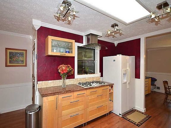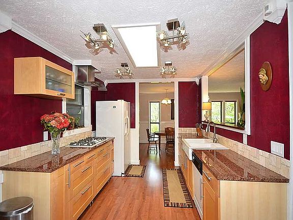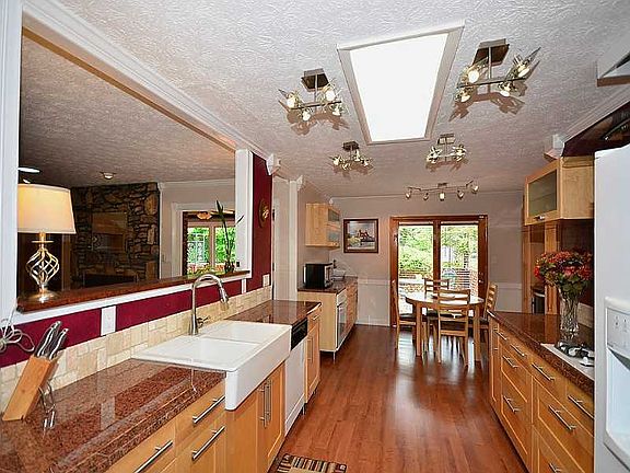 This is a WOW house! Owners have spared no expense on a gourmet kitchen and lavish bathrooms. Kitchen features new cabinetry with soft close drawers, skylight, custom lighting, second sink in prep area and integrated wine cooler. Off family room is a glassed in sunroom with separate ac/heat pump. Home has two car garage plus a third drive under garage with separate driveway. Baths are renovated with soaking tub, neo angle showers and heated towel rack. 485 sq. feet of deck space. Professionally fully fenced landscaped yard. Finished basement, walk to school!