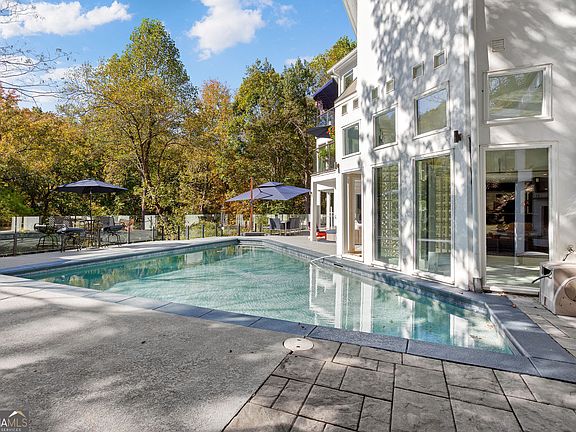 Welcome to your private contemporary retreat set on two beautifully wooded acres in the heart of Buckhead. This gated modern residence showcases striking architecture, exceptional indoor-outdoor living including an inviting salt water pool, a fully equipped outdoor kitchen, and an impressive list of recent upgrades that elevate every aspect of the home. Inside, soaring vaulted spaces are filled with natural light, framed by walls of floor-to-ceiling glass overlooking the tranquil wooded setting and pool. Crystal chandeliers add elegance to the open living areas, which flow seamlessly to a custom-designed bar featuring wine refrigerators, a dishwasher, display shelving, and generous cabinetry just steps from the modern chef's kitchen with doors opening to a porch above the pool terrace. The light-filled dining area is ideally positioned between the kitchen, entertainment bar, and living room, creating a seamless layout perfect for everyday living and effortless entertaining. Upstairs, the private primary suite offers a fireplace, secluded patio, dual dressing rooms with custom California Closets. The luxurious white marble bath is complemented by serene, floor-to-ceiling private views. Also on the upper level, a private office wing provides a dedicated workspace or creative studio, accessible through the second dressing room or via a separate exterior entry. On the main level, four spacious bedrooms include two with en suite baths and two sharing a dual-vanity bathroom. The terrace level features a living area with a full kitchen, a bedroom and bath, and a second expansive living room with floor-to-ceiling windows and blackout shades-ideal for guests or movie nights. Outdoor living truly shines. The pool terrace boasts a newly added covered porch with a stacked-stone fireplace, infrared heaters, and a full outdoor kitchen. New glass railings frame the refinished deck for unobstructed views, while dual spas enhance the resort-like experience. The pool can be enjoyed year-round, and all pool equipment has been replaced by the current owner. Additional highlights include California Closets throughout all bedrooms, relined fireplaces, new lighting and ceiling fans, whole-house water filtration and reverse osmosis systems, new gutters and downspouts, updated security and Ring camera systems, and a two-car garage with storage above plus guest driveway parking. Ideally located just minutes from Lovett, Pace, and Westminster, as well as Buckhead's premier shopping and dining, this exceptional home captures the essence of Buckhead living-private, peaceful, and perfectly connected.