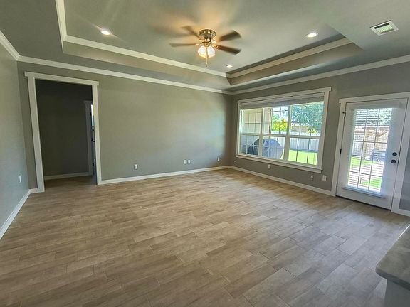 The house has elegant neutral colors and wood look tile throughout, except in the 3 generously sized bedrooms, which have lush carpet.