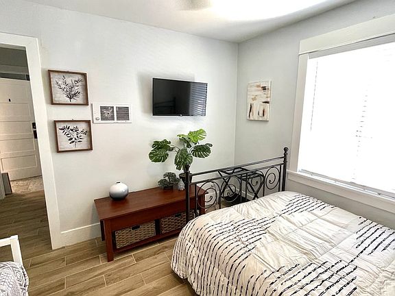 Inside, you'll find a pristine, remodeled kitchen with stainless steel appliances. Washer and dryer included. The kitchen is thoughtfully designed with a partial partition, creating a distinct space that feels almost like a one-bedroom setup. The open-concept living and bedroom area is perfect for both entertaining and relaxing. The bathroom has been updated. Generously sized, this unit is filled with natural light and ample storage space. Washer/dryer combo unit included.