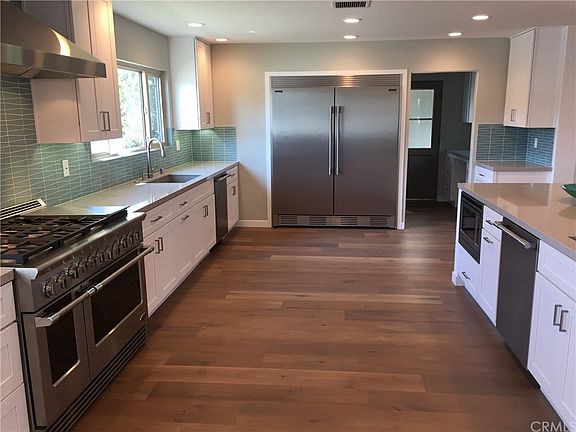 This fully remodeled home in Lakewood Country Club Estates is truly one of a kind. Designed by James Hahn in the mid century modern aesthetic this 3,179 sq/ft rambling ranch is located on an sprawling 12,334 sq/ft corner lot. As you enter the home through the oversized 42" flush door you immediately appreciate the light and bright open concept floor plan with soaring ceilings. The massive kitchen spills into two generous living spaces, each boasting fireplaces, making for a striking living environment. Top-of-the line appliances, including a professional dual fuel DCS 48" range with 6 burners, indoor grill, and two ovens, full restaurant style refrigerator and freezer, wine fridge, two dishwashers, two sinks both with garbage disposals, and expansive island makes for a true chefs entertainers kitchen. The master is very spacious with room for a sitting area and offers access to the back yard and patios through a sliding glass door. The master bathroom is a statement highlighted by a beautiful matte tiled shower with frameless glass enclosure, freestanding soaking tub, two separate vanities, and beautiful view of the yard make this space a spa like retreat. Engineered wood flooring and brand-new modern low pile carpet throughout. Statement walk-in master closet with California Closets organizers, which can also be found throughout the home. Functional and unique 3 car drive-through garage with doors that open to the street and backyard.