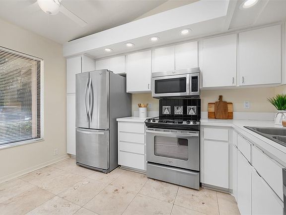This spacious well-maintained, move-in ready, two-bedroom, two-bath townhome flat offers maintenance-free living at its finest. The bright, open floor plan features vaulted ceilings, creating an airy and inviting atmosphere. The kitchen has plenty of cabinet space, a pantry, an eat-in area, and a breakfast bar that opens to the dining room and great room. The great room is highlighted by a triple sliding glass door that leads to a screened porch with serene views of a private pond and fountain.The primary suite includes an en suite bath, a double slider glass door, a generous walk-in closet, a large vanity, and a walk-in shower. The sizable secondary bedroom has easy access to a hall bath with a tub/shower combination. Engineered wood and tile flooring throughout—no carpet. Additional conveniences include an inside laundry closet, a storage room off the screened porch, two assigned parking spaces, and guest parking. Wood Creek Village is a private community with its own pool and cabana. It is NOT a condominium association making it easier for financing. Ideally located in the heart of Gainesville, this home is just minutes from Fresh Market, Publix, popular restaurants, and shopping.
