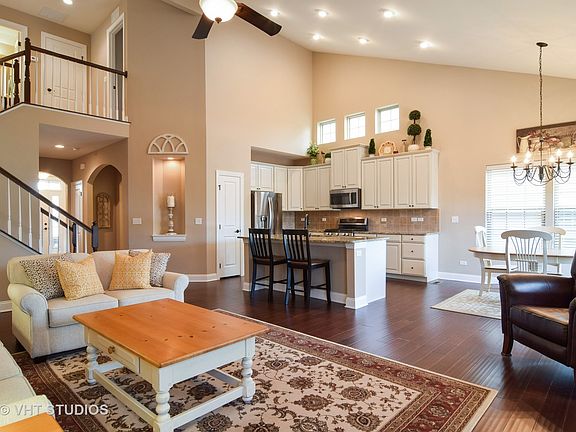 Pond view, maintenance free living, open floor plan with exquisite finishes & premium upgrades. A truly distinctive property has everything on the list. First floor master suite, custom walk in closet, luxury bath, dual sinks, tub, walk in shower. Chef's kitchen, lots of cabinetry, granite, SS appliances, eat in area, island, pantry, backsplash, open to great room. 1st floor laundry, additional cabinets, washer/dryer stay. Formal dining room. 2nd floor loft great for office/flex/living space with full bath, additional bedroom. Beautifully finished lower level, full bath, spacious rec, bonus room, custom cabinet nook & ample storage. 2 car garage highlighted by epoxy floor. 2-tired custom deck backs to cul-de-sac. Other features, vaulted ceiling, hardwood floors, rubbed oil bronze hardware, white doors/trim, landscaping, blinds, crown molding. Short distance to Geneva's restaurants, shopping, walking/bike trails, farmer's market, seasonal festivities. Move in ready!