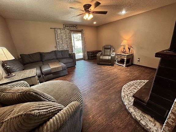 This beautiful home offers SO many attractive features, it's a 'must see'! The kitchen is fabulously spacious, but cozy too, with plenty of space for family or friends to gather, and an island with seating for great conversation! Plus, there's tile floor covering and recently installed Anderson brand glass doors for access to the front patio...the adjacent roomy living area features an attractive electric fireplace to cozy up this space, and a recently installed Anderson brand sliding glass door to the back patio! The primary bedroom is isolated, and HuGE, with a private full bath. All rooms, accept for the tiled kitchen, laundry & entry, have exceptionally attractive wood look floor covering. The back patio is large and partially covered for outdoor gatherings, and there's a dog run!