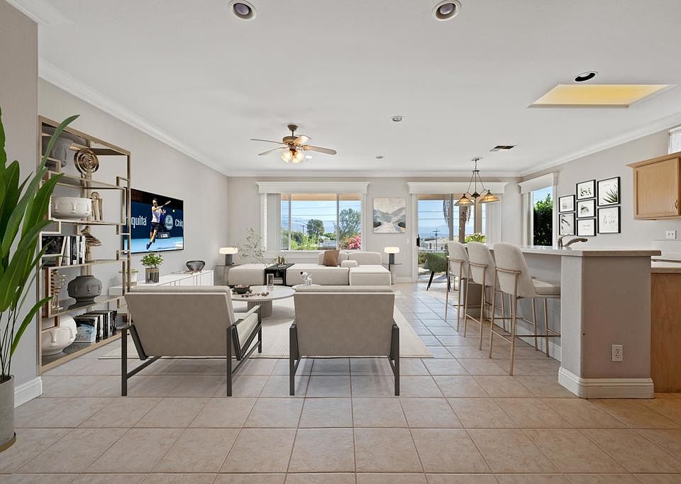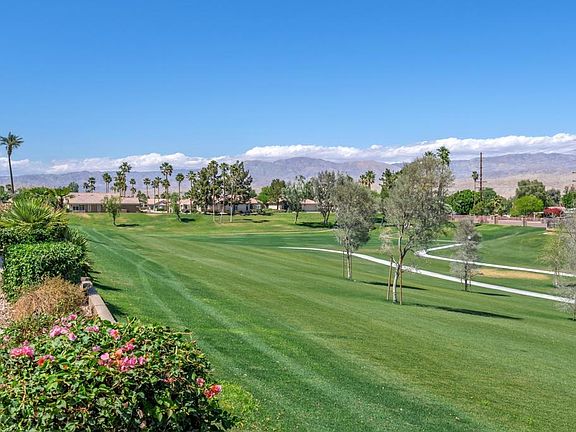 Sun City Palm Desert - Cayman. This popular great room home sits over a lush greenbelt. Enjoy panoramic mountain views from the east facing rear yard that features a spacious patio with alumawood patio cover and low maintenance desert landscaping with panoramic golf course and Mountain View. Inside, tile flooring is in all but the bedrooms and den. Crown molding is in the greatroom and den. The kitchen features extensive cabinetry, an island with breakfast bar and corian counters. Off the greatroom is a spacious den/office. The primary suite has a large walk-in closet with mirrored wardrobe doors. The primary suite bathroom has dual sinks and a stall-shower with glass enclosure. A tub/shower is in the guest bathroom. The guest bedroom also has a closet with mirrored wardrobe doors. Laundry is located inside the house. The 2-car garage has space for plenty of storage. AC new 2017.