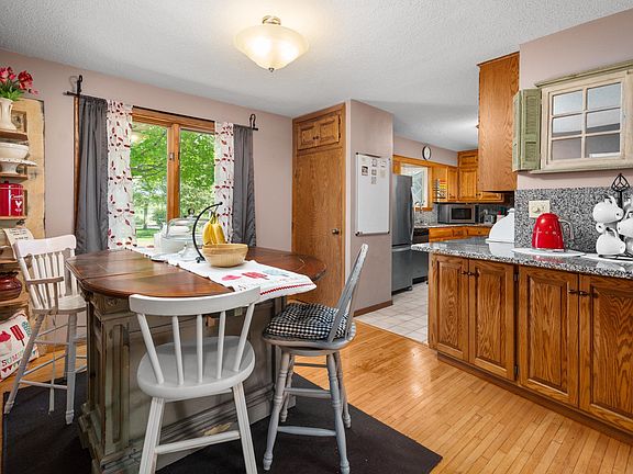 Complete backyard privacy with amazing views. 3-bed, 2-bath home tucked away on 1.26 acres of natural beauty. Step into the living room where sunlight pours through the large picture window and a gas fireplace adds cozy charm. The kitchen is both stylish and functional with beautiful hardwood floors, granite countertops, and stainless steel appliances. Just beyond, a spacious screened-in porch offers the perfect spot to sip your morning coffee while overlooking the peaceful backyard. Outside, you’ll find vibrant flower gardens, mature trees, and apple trees that reward you each year with an abundance of fruit. Gather with friends around the paved fire pit patio or relax in the hot tub, surrounded by nature. There is a well for out door use including the sprinkler system. A insulated and heated oversized 2-stall garage provides plenty of room for storage or hobbies. The lower level could easily be a living quarters for your adult kids that are still at home but would like their own space. This home is more than a place to live—it’s a place to enjoy every season.