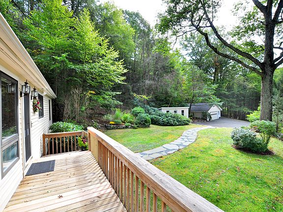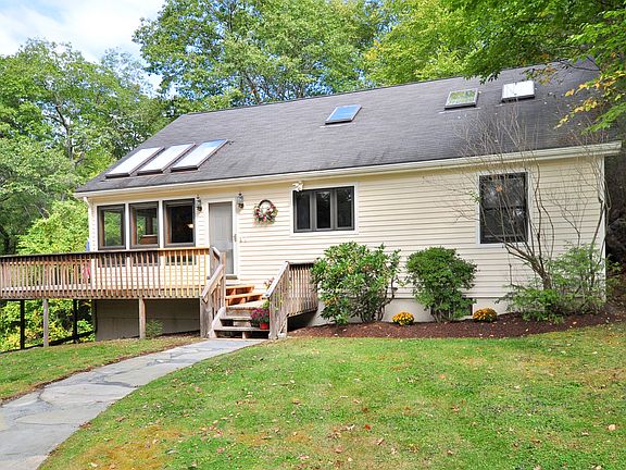 Tucked away on a private, wooded lot, this home offers peaceful views and a versatile layout. A spacious deck overlooks a picturesque brook and professionally landscaped grounds, complemented by two garages and a shed. Upon entering this gem you will be greeted with an open floor plan featuring a stone wood-burning fireplace, cathedral ceilings, exposed beams, skylights, and walls of windows that fill the living and dining areas with natural light you will feel like you are tucked away in the mountains of Vermont.The large kitchen flows seamlessly into the main living space, perfect for gatherings. Two bedrooms and a full bath complete the main level, with one bedroom currently used as an office. At the top of the stairs, a striking landing overlooks the living room/dining room before leading to the private primary suite with skylights, three closets, and a full bath. The finished lower level offers tall ceilings, a full kitchen with gas stove, full bath, sitting room, laundry hookups, and a walkout. Town-approved for an accessory apartment (see agent remarks). Additional features include a newly repointed chimney, 200 amp service, baseboard heating, split heating/AC on each level, newer buderus boiler and a whole house generator with automatic transfer switch.