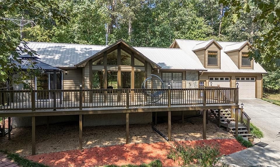 Rustic Retreat on Pine Log Creek – This cedar-sided cabin-style home perfectly blends small farm living with outdoor adventure. Nestled along Pine Log Creek, a designated trout stream, the property offers private access to fishing and peaceful relaxation right in your own backyard. Approximately two acres are already fenced and ready for animals. The well-maintained barn includes a horse stable, tack room, run-in, 8’ x 12’ roll-up door with separate entrance, 220-amp service, plumbing for water, and an attached lean-to. Additional features include a spacious chicken coop, fenced dog lot, and a woodworking shop with its own lean-to. A seasonal creek winds through the property, adding to its natural charm. Outdoor living shines here with two firepit areas, two mature fig trees, and a garden plot ready for vegetables. Expansive decking spans the full front of the home and includes a large gazebo—ideal for relaxing or watching wildlife. Off the sunroom, a covered back porch offers another inviting space to enjoy the outdoors. Inside, the living room feels warm yet open, featuring English Walnut hardwood floors, a pellet stove, tall cathedral ceiling with beams, and oversized windows that flood the space with light. The adjoining dining room leads to a recently added sunroom, expanding the living area. For added comfort, the great room includes a propane wall unit as backup heat during outages. The master suite is a private retreat with hand-hewn hickory floors, a walk-in closet, double vanity, separate shower, and a freestanding claw-foot tub for soaking. Two guest bedrooms open directly onto the deck through French doors, creating seamless indoor-outdoor flow. Above the attached two-car garage, a spacious bonus suite offers a full bath, closet, and kitchenette—ideal for guests, teens, or extended family. (Note: Tax record square footage is inaccurate; owner’s estimate is more reliable.)
