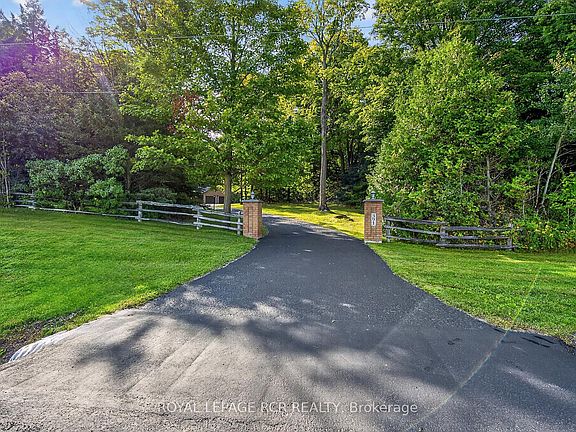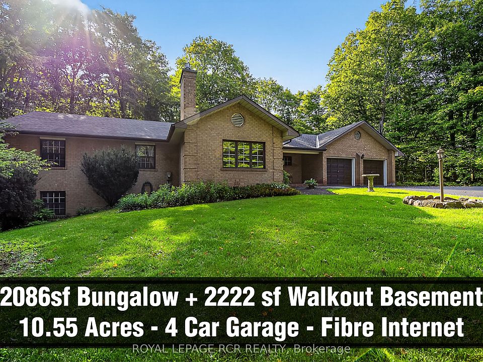 10.55 Acres * Fibre Optic Internet * 3+1 bedroom Bungalow with side walk-out finished basement with in-law suite potential, 4 car garage and long private driveway. It is conveniently located in desirable Goodwood in West Uxbridge within minutes to Hwy 407, Go Train, all amenities and the Town of Stouffville. Enjoy the inviting 3 bedroom layout offering a charming beamed living room with stone fireplace and built-in shelving, a kitchen with an abundance of cabinets and breakfast bar, a huge dining room with picture windows and walk-out to yard, 3 bedrooms, 2 baths and a large main floor laundry room. The separate side entrance, walk-out basement features a large bedroom, kitchenette, recreation room, games room, 3pc bath and an office. Car enthusiasts and hobbyists will appreciate the massive drive-through four-car garage, a rare and highly functional feature. This space offers ample room for vehicles, storage, and a workshop, with the convenience of easy access to the back of the property. An amazing highlight of this property is the expansive breathtaking outdoor space. The 10.55 acres boast a mix of dense forest and open land. The private forest trails wind through the trees, leading to a massive, four-acre cleared space at the back of the property. This open area is perfect for a hobby farm, recreational activities, or simply enjoying the open sky. Welcome to the perfect combination of tranquility and convenience!