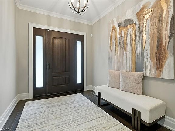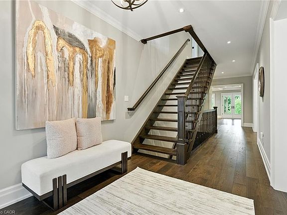 Custom-built in 2016 by M. Butler Custom Homes, this exceptional residence offers approximately 5,000 square feet of luxurious living space, showcasing premium finishes and superior craftsmanship throughout. Situated on a 217-ft deep, pool-sized lot backing onto the RBG Hendrie Valley Sanctuary, this home blends elegance with natural serenity. The gourmet kitchen features a large island with dual-sided cabinetry, sink and pendant lighting, along with built-in stainless steel appliances including a wall oven, gas cooktop, fridge and dishwasher plus a sunlit eat-in area overlooking the private backyard. Rich hardwood flooring spans the main and second levels, complemented by hardwood stairs, coffered ceilings, crown moulding and pot lights that add warmth and architectural detail. The private primary suite includes a luxurious spa-like ensuite and two walk-in closets with custom built-ins. A finished walk-out lower level adds flexible living space, offering a fifth bedroom, full bathroom, rec room and multi-use area perfect for an office, gym, craft room or playroom. An upper-level balcony off the great room extends the living space outdoors and features a gas BBQ hook-up. Additional highlights include oversized windows, engineered hardwood, central vacuum and full home pre-wiring for automation and audio/video distribution. Ideally located minutes from Aldershot GO Station, Highways 403 and 407, as well as nearby restaurants and shopping. Don’t be TOO LATE*! *REG TM. RSA. Luxury Certified.