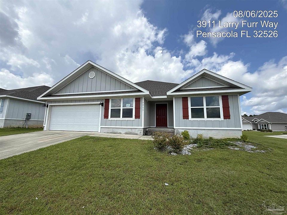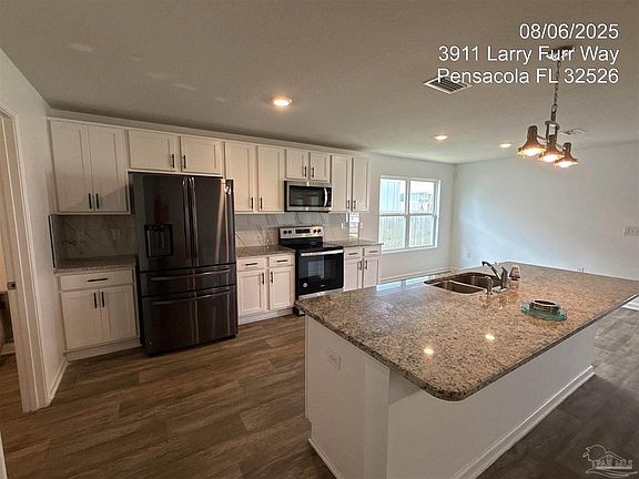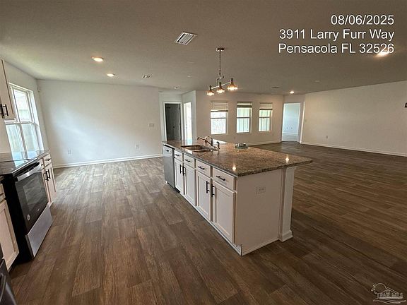 Welcome to 3911 Larry Furr Way – a spacious and beautifully designed 5-bedroom, 3-bath home located just minutes from Navy Federal and convenient to shopping, dining, and schools. This modern home features an open floor plan perfect for entertaining, with a large living room that flows seamlessly into the kitchen and dining areas. The kitchen is a chef's dream, boasting granite countertops, an undermount sink, stainless steel appliances, a large island, and plenty of cabinet space. The primary suite offers a relaxing retreat with a double vanity, 5-ft shower, and an oversized closet. Throughout the main living areas, you'll find stylish wood-look vinyl plank flooring, with carpet in the bedrooms for added comfort. Enjoy Florida living year-round with a covered patio perfect for outdoor gatherings and a community pool in the neighborhood. Additional highlights include a 2-car garage, spacious laundry room, and energy-efficient features. Don't miss your chance to make this your Next Home!