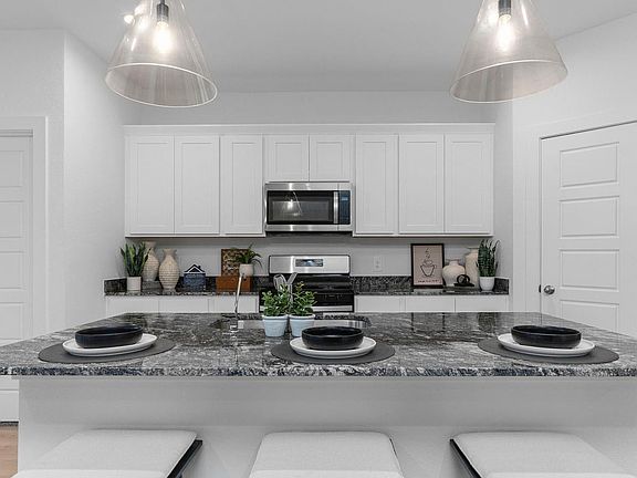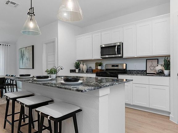 The open-concept L-shaped kitchen, family room, and dining room make this space perfect for hosting. The kitchen features stainless-steel appliances, an island, and a pantry.