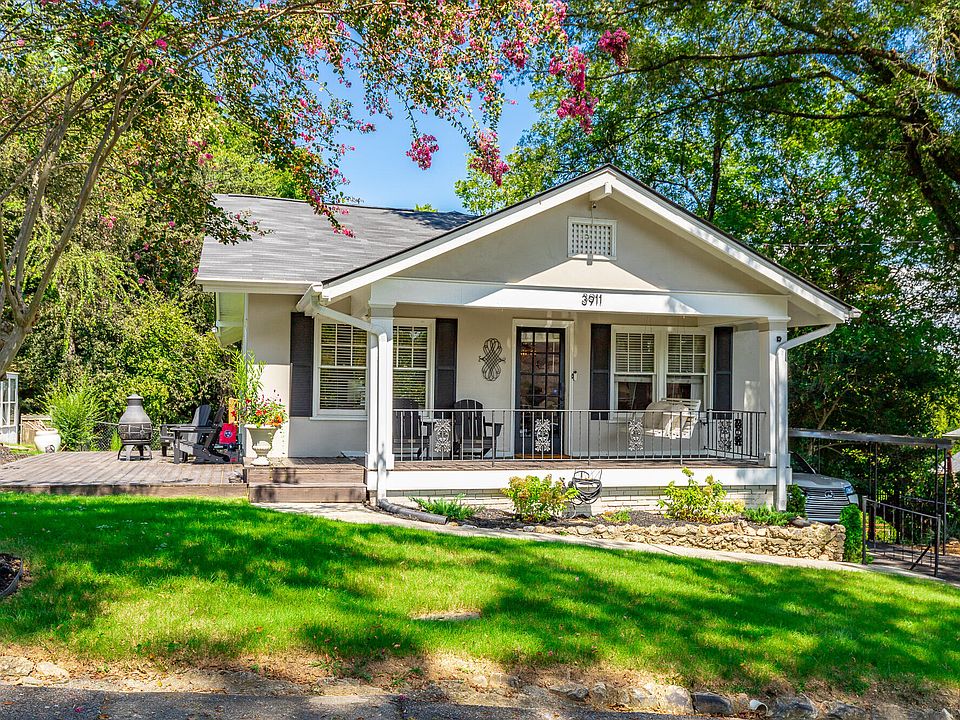 Beautiful bungalow home on one of Chattanooga's most sought after tree lined streets in the historic Hilltop / Belvoir community. Natural sunlight filtrates throughout this one level home. A generous front porch with original wrought iron railing, new landscape, new Bermuda sod, and elegant outdoor lighting for enjoyment. Original hardwood floors throughout the living room, dining room and butlers pantry and thick crown molding, a tribute to the 1940s true craftsman era. The brick fireplace with natural gas ventless logs is wonderful in colder months. Laundry with washer and dryer hookup located on the main level. The kitchen provides original exposed brick, tile floors, granite counters, recessed lighting, and all appliances. The mudroom just off the kitchen leads to the new back deck with a pet door to the fully fenced backyard. The front bedroom is currently used as a home office (EPB Fiber Optics Internet). The owner's suite provides sky lights over a double vanity with mirror light sconces, tiled shower with rainfall showerhead and extra large walk in closet. The third bedroom and guest bathroom is located off the hallway. Plenty of closets and storage cupboards. BRAND NEW ROOF installed June 2025. New asphalt driveway extended for additional parking. The walkout unfinished cellar/basement provides great storage and could be partially finished for additional owner's access into home. The homes of Hilltop / Belvoir offer character and charm in a convenient location to everything Chattanooga has to offer for business or leisure. EPB Electricity and Fiber, Chattanooga Natural Gas, city trash and recycling service! 3911 Sunbeam Ave is a wonderful home to build your life and equity in Chattanooga, TN. with direct flights to many cities across the nation.