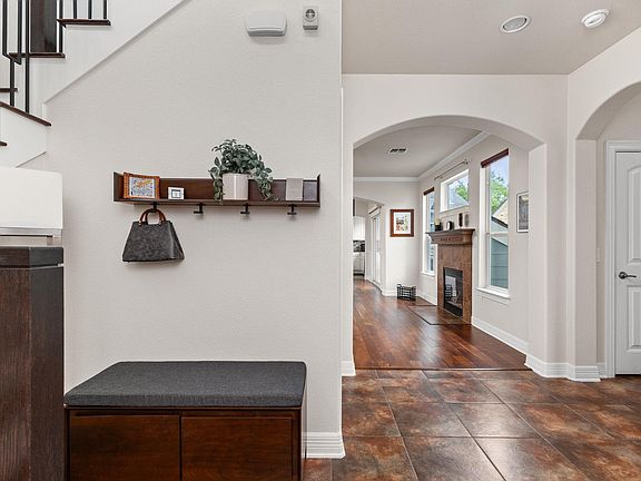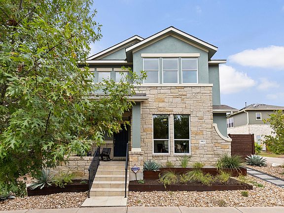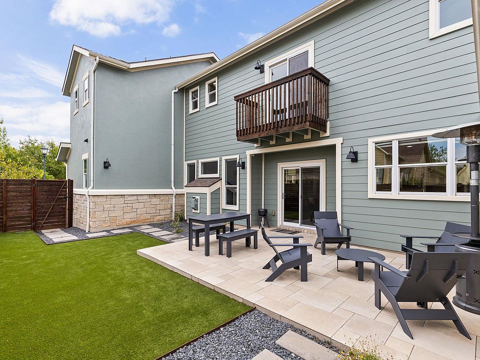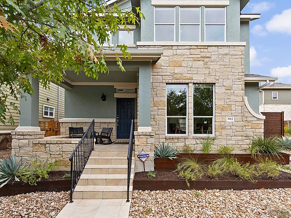 This beautiful 3-bedroom corner-lot residence offers the perfect balance of comfort and function in the heart of Mueller. Step inside to a welcoming entry foyer and a sunlit home office, ideal for working or studying from home. The generously sized living room features a cozy gas fireplace and seamlessly connects to the dining area. A sliding glass door extends the dining space outdoors, creating an effortless setup for entertaining. The kitchen is well appointed with abundant counter space, cabinetry, and a central island—perfect for gatherings with family and friends. But the true showstopper of this home is the large, professionally landscaped and very private backyard. Designed with entertaining in mind, it showcases lush artificial turf, a stunning tiled patio large enough for both dining and lounging, and plenty of space to host memorable gatherings. The front yard is equally eye-catching with low-maintenance xeriscaping. Upstairs, you’ll find two secondary bedrooms, a full bath, and a well-appointed owner’s suite. The suite offers a walk-in closet and a bath with dual vanities, a soaking tub, and a separate shower. Throughout the home, you’ll also appreciate that there’s no carpet, making it both low-maintenance and comfortable for everyday living. Freshly painted inside and out, this home shines from every angle. Just one block from Ella Wooten Park and Pool, one block from the Southwest Greenway, and within walking distance to Mueller Lake Park and all the great restaurants and businesses Mueller has to offer. Living in Mueller means enjoying a vibrant, walkable community with two neighborhood pools, over 140 acres of green space filled with trails, parks, and play areas, plus a lively town center with restaurants, coffee shops, a movie theater, and H-E-B. A one-of-a-kind home with a rare, private oversized yard that doesn’t come up often in Mueller—this is truly a gem you won’t want to miss.
