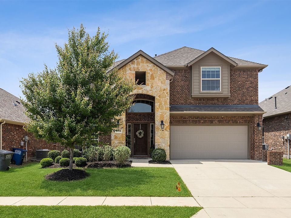 Sophisticated 4 bed, 2.5 bath Frisco home! Soaring ceilings and large windows allow the home to be filled with natural light! The inviting living room with a stately fireplace sits at the heart of this spacious open floorplan! The modern eat-in kitchen offers built-in stainless steel appliances, an island, a breakfast bar, granite counters, a pantry, and a bright breakfast nook! The serene primary bedroom boasts an ensuite bath with a separate shower, large soaking tub, dual sinks, and a walk-in closet. Spacious secondary bedrooms and bath. You will appreciate the private backyard with a covered patio that provides additional outdoor living and entertaining space. Excellent location with great community amenities that include a playground, pickleball court, basketball court, and community pool with slide. Many nearby parks, Lake, shopping, dining, and entertainment options. Don't miss your chance to call this Frisco home your own! 3D tour is available online.