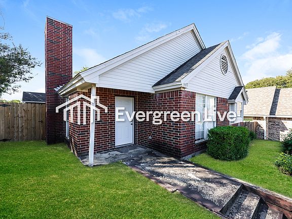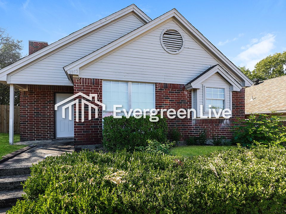 This 2-bedroom, 2-bathroom home in Dallas, TX is situated on a quiet cul-de-sac and features a classic brick exterior and a private rear-entry one-car garage with its own driveway. Step inside to find soaring vaulted ceilings and stylish chandelier lighting that enhance the sense of space and brightness throughout the home. Luxury vinyl plank flooring flows seamlessly across the main living areas, offering both durability and style. The living room centers around a white mantel, creating a warm and welcoming focal point. The eat-in kitchen is bright and functional, featuring white cabinetry, a white tile backsplash, and plenty of natural light from well-placed windows. A breakfast bar and serving window offer convenient transitions between the kitchen and living spaces, making the layout ideal for everyday use. Both bedrooms are comfortably sized, and the bathrooms include shower-tub combinations and clean, modern finishes designed for daily functionality. This home combines comfortable living with a smart layout in a desirable Dallas location