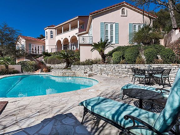 Downtown views from the front door, lots of natural light, and a large .836ac lot. The Spanish architecture is warm and inviting with gorgeous tile floors, tile roof, generous archways, and great entertaining spaces. The master bedroom is on the main level with his and hers bathrooms, as well as an office or additional bedroom. The second level has two additional bedrooms with ensuite bathrooms. The backyard is terraced and peaceful, while the front of the home includes a pool and gorgeous landscaping. Sport court also on property. Home feeds into Casis Elementary!