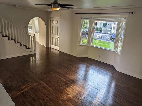 Charming 2 story house on large park-like grounds with swimming pool located south of Ventura Blvd across from desirable Carpenter Community Charter School. 2 bedrooms, 2 baths, separate dining room & 2 car garage with washer/dryer. Beautiful oak wood floors & new double pane windows. Walking distance to dining. 1402 sq. ft. Pet friendly.