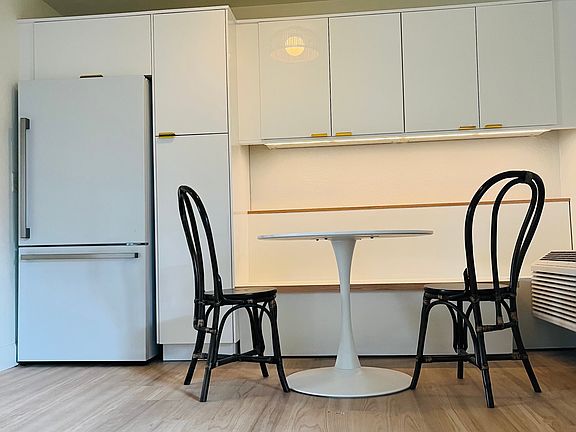 Renovated, light-filled 1BR/1BA condo with open-plan living and courtyard views. The cook's kitchen features updated appliances (dishwasher, oven, and full-size fridge), extensive storage, built-in banquette seating for entertaining, and an in-unit washer/dryer combo. A custom media wall includes built-in storage and desk. The bathroom includes a shower/tub combo, new toilet, new vanity with mirrored storage, and natural light. The bedroom offers a large built-in wardrobe, bedside lighting, and drawers. The apartment is semi-furnished: dining table and chairs, an ergonomic desk chair, and a chest of drawers (all you need to bring is a bed and couch!). Located on the second floor overlooking a leafy central courtyard with mature trees and benches. Corner work-from-home desk area enjoys garden views. One assigned parking space included; visitor parking available. Key features Renovated 1BR/1BA; light-filled, open plan Updated kitchen + in-unit washer/dryer combo Media wall, banquette seating and fluted wood accents Semi-furnished (see inclusions) Courtyard views; dedicated WFH nook 1-year lease, small pets allowed, water included
