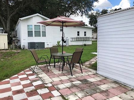 Location, locations. Directly across from the Clubhouse, heated swimming pool, billiards room, and Shuffleboard court. Park-like setting with majestic oak trees to welcome you home. Active 55 plus community. Home features easy care laminate and vinyl flooring. Newer carpet in the bedroom. Spacious Laundry room. Washer and dryer are only 3 years old and are included with the sale. The full-size refrigerator is also 3 years new. Hot water heater installed 6 months ago, new bed purchased Aug 2019. Living room furniture purchased two years ago. Florida room is approx 17' x 8' and offers electric fireplace for those cozy stay at home moments, newer a/c unit to keep you cool and all furniture conveys. On the exterior, you have two-car tandem parking, 8x10 storage shed with electric, Two patio areas great for grilling and entertaining your new friends. Well cared for flower garden and covered front porch. The home is on leased land with a monthly lot rent of $399.00 which includes lawn mowing, trash and all community amenities such as Heated swimming pool, Huge shuffleboard court, clubhouse, outdoor cooking station under the oaks and outdoor firepit for gatherings with friends and family. Come on home to Waters Edge.
