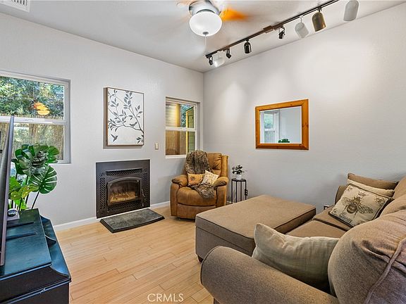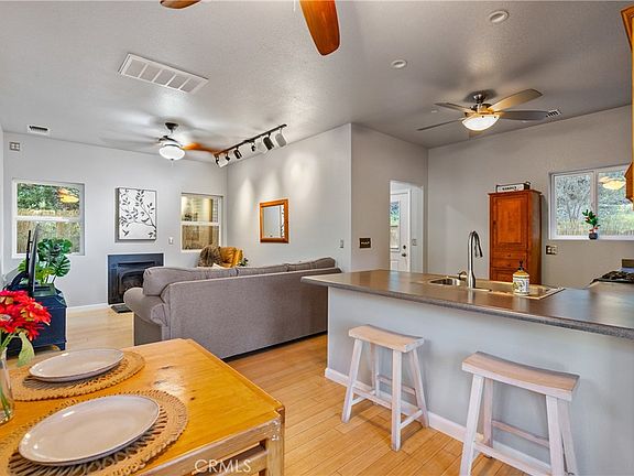 The 2 x 6 constructed main house features an open floor plan with an open kitchen on the lower floor, along with dining, and living area, all complemented by bamboo flooring throughout. On the main floor, you'll also find a convenient laundry and powder room. A cozy wood-burning fireplace adds warmth to the living space, while a covered concrete patio equipped with ceiling fans is perfect for outdoor relaxation.