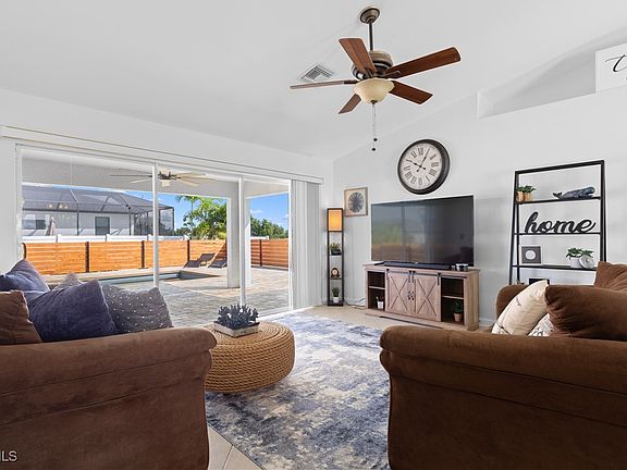 This turnkey pool home is located in a quiet area of NW Cape Coral surrounded by new homes. The property features mature landscaping and a welcoming front porch.