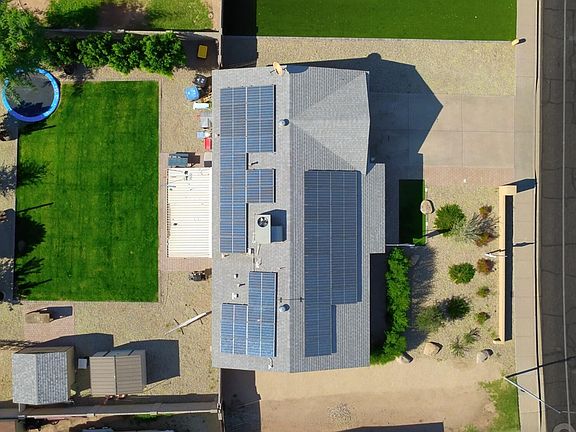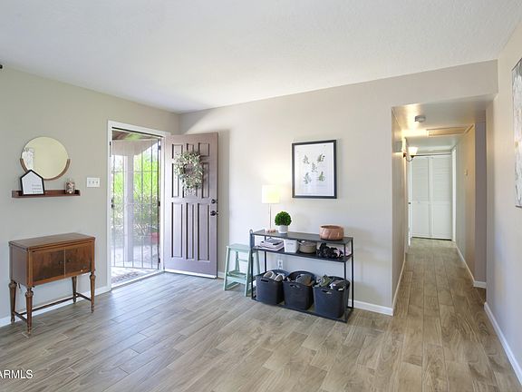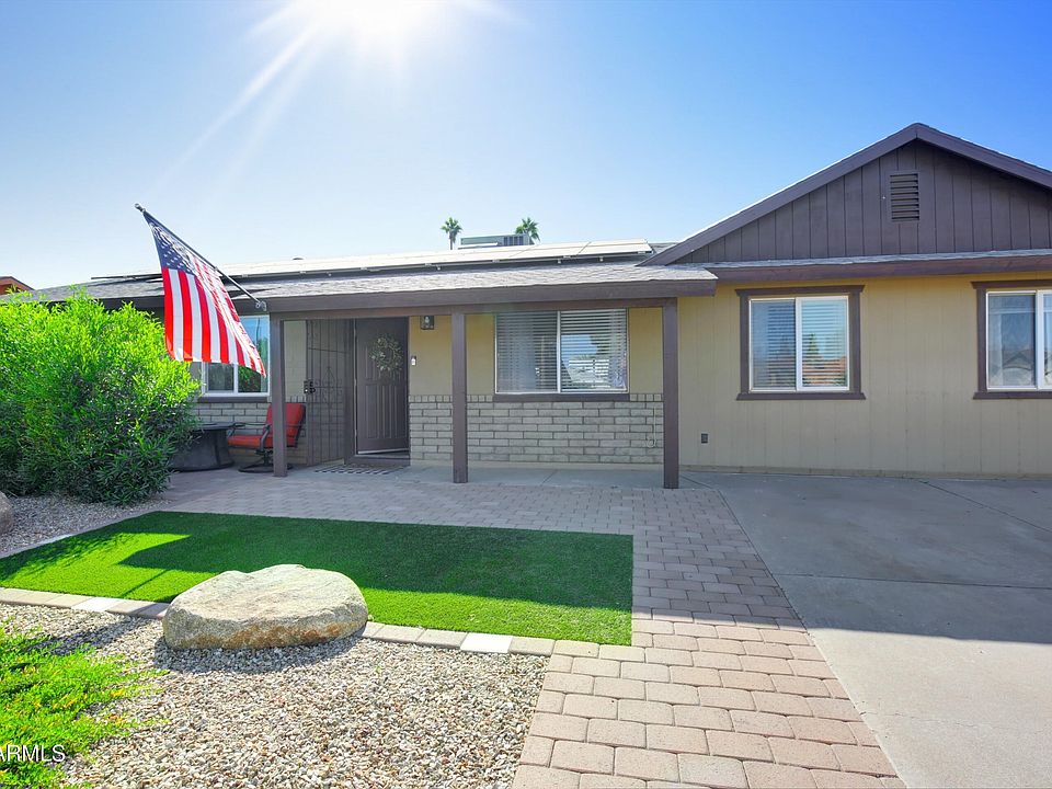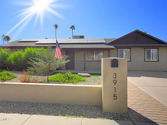 Welcome home to this charming and updated 4-bed, 2-bath ranch in Northwest Phoenix! Enjoy a stylish kitchen with charcoal cabinets, concrete-look counters, and a subway tile backsplash. Three bedrooms sit together, plus a large flex 4th bedroom with a walk-in closet—ideal as a hobby room, playroom, or home office. The backyard is a true highlight with a grassy play area, mature shade trees, a covered patio, in-ground trampoline, and storage sheds. You will love the large indoor laundry/pantry - adding storage and space for a second fridge. Wood-look tile in main areas, ceiling fans, and leased solar help keep life comfortable. Fantastic curb appeal and a welcoming front porch complete the package—come take a look and you will fall in love!