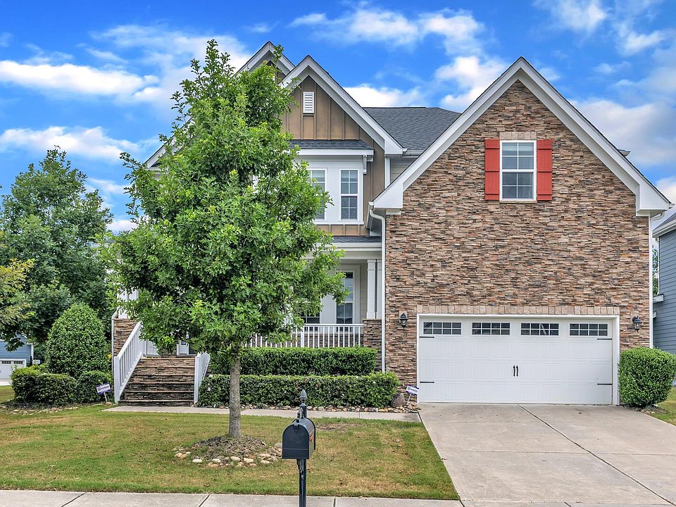 Former Belmont Model Home with 5 bedrooms and 4.5 bathrooms, located in the desirable Apex area. Extensive details throughout! The open-concept design begins at the spacious foyer with a two-story staircase and window. Hardwood floors throughout both levels. Oversized gourmet kitchen with extended cabinets, stainless steel appliances, built-in microwave and oven—all overlooking the family room for a large, open feel. Guest suite on the main floor with walk-in shower.The private owner's suite, with tray ceiling and additional windows and extended dresser shelf and desk offers comfort and style. Custom feel throughout w/ double crown molding along w/ thoughtful upgrades enhance comfort and functionality, built-in custom closet. Tankless water heater, gas line for grill, finished garage w/ epoxy flooring, Lovely corner cul-de-sac homesite with fenced backyard &screened in porch for outdoor retreat. Beaver Creek shopping center is mins away. Highway 540 & 64. Easy access to RTP & RDU. This location cannot be beat!