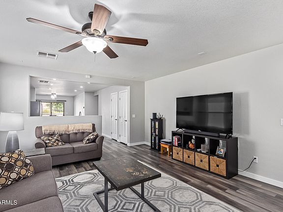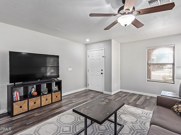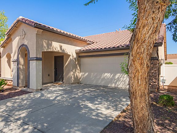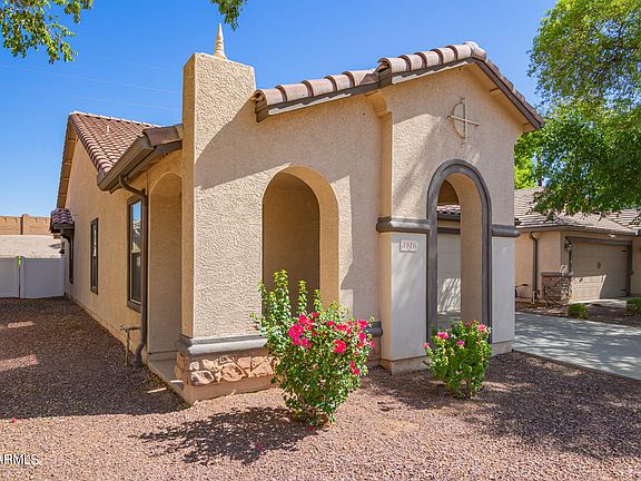 This charming, well-maintained home is everything you've been looking for. Step inside to discover a spacious interior, featuring a large kitchen with recessed lighting, sleek white cabinets, and an island. The bright dining area, with sliding glass doors leading to the back patio, is perfect for enjoying meals w/ a view. Rest well after a busy day in the primary bedroom that features a well-sized closet and dual sinks in the private bathroom. The secondary bedrooms are equally inviting, complete with cozy plush carpets and ample closet space. Outside, you'll find a beautifully landscaped backyard with a covered patio, pavers, and low-maintenance artificial turf—ideal for relaxation and entertaining. Don't forget to stop by the community pool, located just just South of the home!!!