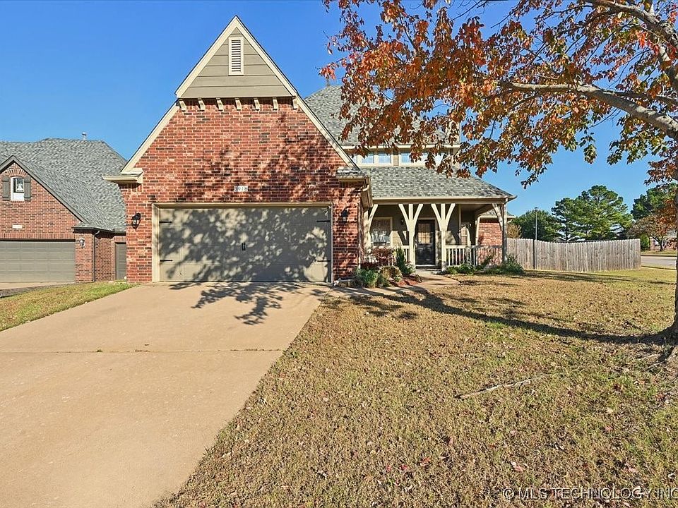 Spacious full brick home on large corner/cul-de-sac lot in highly-desired South BA neighborhood, Villages of Birchwood! Covered, wrap-around front porch. 4 bedrooms, 2.5 baths and 3 car tandem garage. Newer hardwood floors in foyer extend through the formal dining/office and living room. Formal Dining has doors to both the foyer and kitchen and is currently being used as an office. Huge living room with gorgeous 2 story fireplace, ceiling fan and built ins; open to kitchen. Kitchen has granite, new microwave in 2022, gas stove, pantry (with second and third pantry options between the kitchen and laundry room), and planning desk with extra cabinets near the breakfast nook. Formal dining and/or office is located at the front of the home. Good sized laundry room with space to add a drop zone. Primary bedroom is located near the back of the home. Primary bath has a jetted tub, separate shower, double vanity, newer toilet, and large walk-in closet. Large 1/2 bath on level 1. Upstairs has 3 bedrooms (all with walk in closets), bonus room, full bath (w/double sinks & new toilet) and large floored walk-out attic. Upstairs AC has new coil and freon. Covered back patio and spacious yard with full privacy fence (2 gates) and added trees for extra privacy. Broken Arrow Schools (bus stop conveniently located right across the street on Waco). Home is conveniently located near the pool/park and just a short distance to the stocked pond, gazebo-picnic area and entrance to the Turnpike walking/running/cycling trails. Close to schools, turnpike and conveniences!