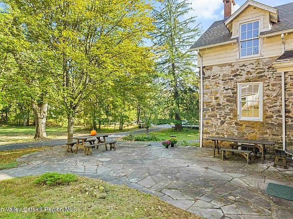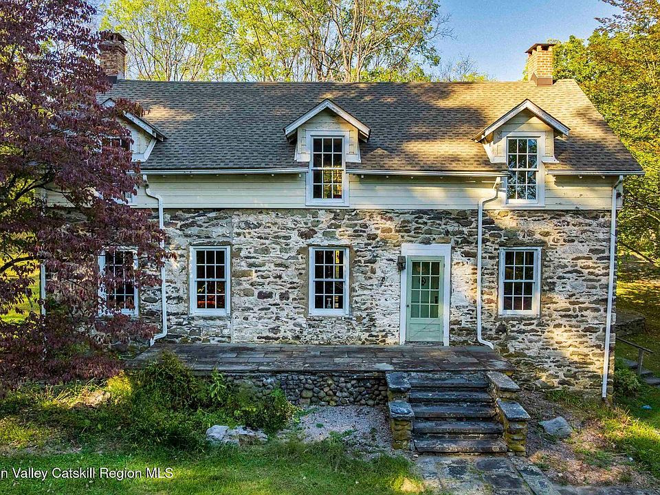 Discover the charm of this stone house in Stone Ridge. Step into history with this masterfully crafted eighteenth century, 2199 sq ft colonial home. Here is an enduring symbol of Hudson Valley craftsmanship surrounded by rolling meadows and majestic hardwoods. Set on approximately 100 acres, including access from two roads. The estate includes the historic and significant mail residence, a delightful two-story guesthouse, and a striking red barn with a full, easily accessible attic and a heated studio room.