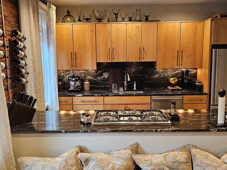 Sleek modern kitchenOpen floor planHardwood floorsStainless steel appliancesExposed brick wallsDesigner textilesSpacious bedrooms