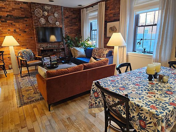 Enjoy a warm, inviting living area, large windows that bring in natural light, and an accent wall of exposed brick that adds character and charm. The space flows seamlessly into a cozy dining area adorned with designer textiles and ambient lighting ideal for dinner parties or quiet evenings.