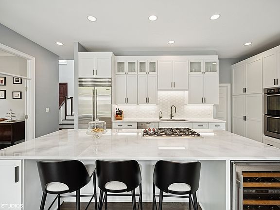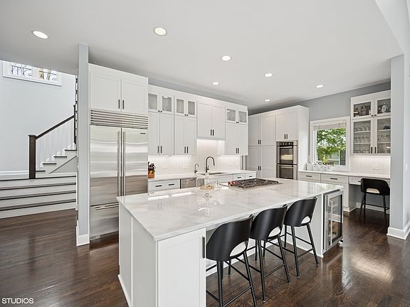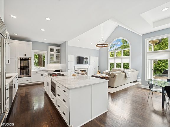 Welcome to this exceptional home in the heart of Glencoe, offering an unbeatable central location just steps from top-rated schools and beautiful parks. Situated on an expansive 78-foot-wide lot, the home features a rare attached two-car garage and a spacious, open feel throughout. As you enter the impressive two-story foyer, it's immediately clear this is a special home. The recently renovated kitchen is a true showstopper, boasting an oversized island, sleek white cabinetry with abundant storage, high-end appliances, and exquisite quartzite countertops. The kitchen seamlessly opens to a casual dining area and a generous family room with soaring vaulted ceilings, a cozy fireplace, and custom built-ins, creating an ideal space for both everyday living and entertaining. The dining room flows effortlessly from the kitchen, perfect for hosting gatherings. A first-floor office offers a quiet, inspiring work-from-home space with serene views of the backyard. Natural light floods the home through large windows and multiple skylights, enhancing the warm and inviting atmosphere. The elegant living room, with its marble fireplace surround, provides a peaceful retreat. Upstairs, the spacious primary suite features a luxurious en suite bath with a separate shower and soaking tub, and a stunning picture window that brings the outdoors in. Three additional bedrooms with vaulted ceilings and two full bathrooms complete the upper level. The finished basement is ideal for recreation, whether you're playing ping pong, working out, or just relaxing. It also includes a fifth bedroom and full bath-perfect for guests or extended family. Outdoors, enjoy a professionally landscaped yard with mature trees and a large stone patio, perfect for summer BBQs and entertaining. Additional features include a first-floor mudroom/laundry room, a whole-house generator, in-ground sprinkler system, and roof melt system. This is a rare opportunity to own a thoughtfully designed, beautifully updated home in one of Glencoe's most desirable locations.