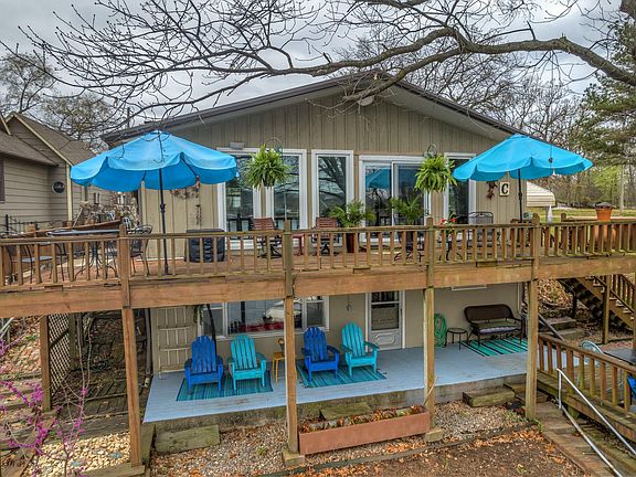 It's a unicorn! Lakefront property with a boat dock, and a 30' x 50' metal building w/ living quarters just across the street! Spectacular views in a wide cove, with main lake views. This property offers 3 bed/2 full bath, with spacious updated kitchen area that opens to dining and living area. Two bedrooms and office/flex room on main level. Downstairs offers a huge bedroom with ensuite bath and walk out to boat dock! And just across the street, you have a metal building with two large bays, living quarters and a bath! Perfect for all your water toys and overflow guests. Updates include newer roof, windows, insulation and HVAC. Kitchen, bathroom and utility rooms recently remodeled and new black top in driveway. No HOA's or dues!