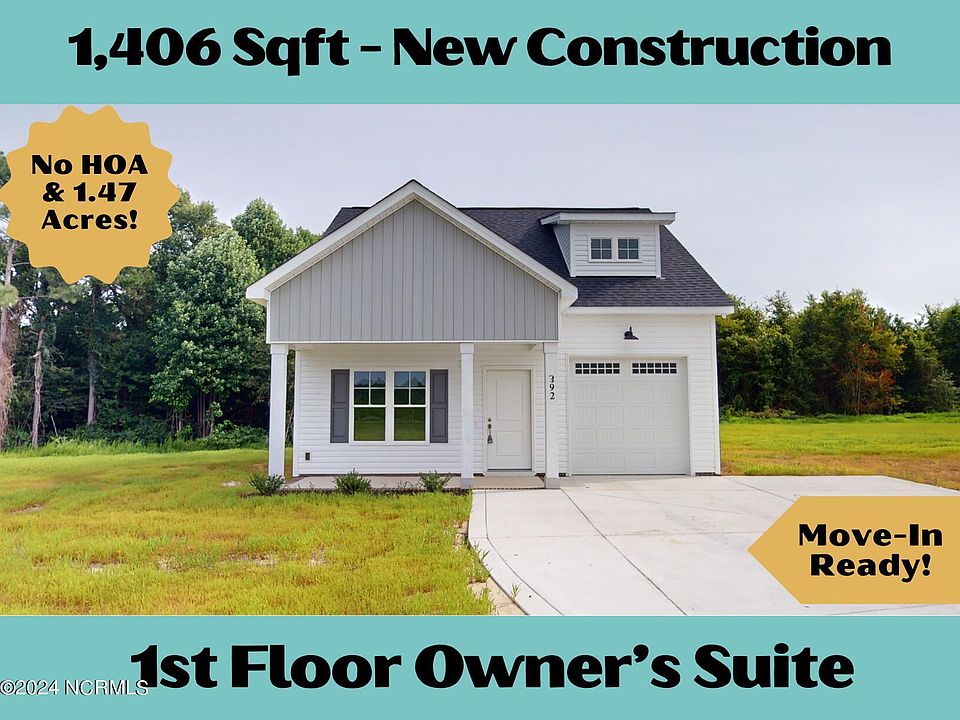 MOVE-IN READY!! The Jeffrey Plan is a NEW 1.5 Story plan w/ Great Curb Appeal that offers approx 1406 sqft with 3 beds and 2 baths on a Large 1.47 Acre Lot w/ a Wooded Buffer in the Rear. *NO HOA*- *Easy Commuting to Goldsboro & SJAFB!*The Large Family Room flows into the Granite Kitchen with Large Pantry. There's a separate laundry area and half bath downstairs. Also, downstairs is the Master Suite boasting double vanities, linen closet, tub/shower and large walk in closet. You'll love the one car garage and the covered front and back porches. Upstairs you'll find the two guest beds and their own guest bath. This home is 17 mins from Goldsboro and SJAFB for easy commuting! Come see this new construction home asap - it is priced to sell!